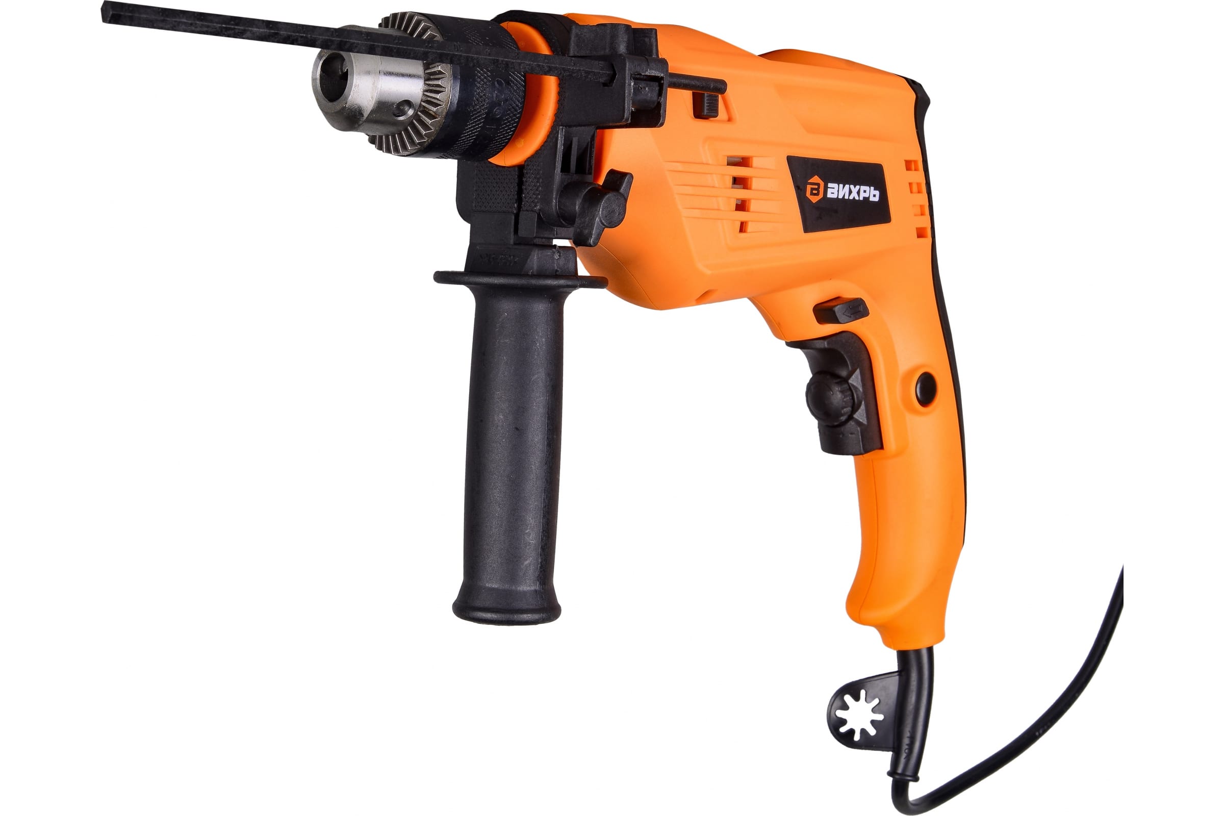 Ударная дрель ВИХРЬ ДУ-700  используется для сверления отверстий в различных материалах. Дрель укомплектована надежным электрическим двигателем мощностью 700 Вт. Для сверления отверстий на заданную глубину предусмотрен специальный ограничитель.  Благодаря ударному механизму с помощью данного инструмента можно сверлить отверстия в бетоне и кирпичной кладке. Рукоятка имеет выступ на нижней части и мягкую вставку для надежного удержания дрели во время работы.