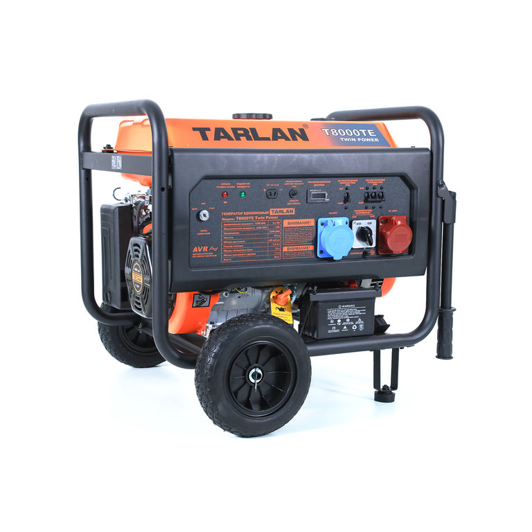 Генератор бензиновый T-8000TE TWIN POWER (380В и 220В, 6500/7000Вт, 15л.с. (11кВт), 438см3, расход топлива 2,8л/ч, бак 25л, время работы 9ч, запуск - ручной+электростарт, счётчик моточасов, 90кг) TARLAN