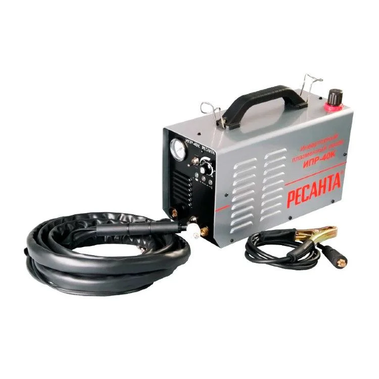 Плазморез Ресанта ИПР 40К – инверторный резак с контактным зажиганием дуги, разработанный для воздушно-плазменной сварки и резки различных металлов. Работа прибора основана на подаче сжатого воздуха через горящую дугу, превращающую воздушную струю в плазму. Аппарат плазменной резки ИПР 40К оборудован плавной ручной регулировкой тока в диапазоне от 15 до 40 Ампер, с обратной полярностью клемм подключения горелки и заземления. В зависимости от толщины листового металла выбирается необходимый сварочный режим, беспрерывная продолжительность которого напрямую зависит от установленного тока. Рабочий цикл при максимальной нагрузке составляет 35%, на минимуме – 100%. Инверторный плазменный резак Ресанта ИПР 40К оборудован эффективной системой вентиляции, обеспечивающей принудительное охлаждение силовых деталей электрической платы с автоматическим отключением от сети при критических нагрузках. В компоновке используется заменяемая горелка и неплавящийся сменный электрод. Поджиг дуги в модели Ресанта ИПР 40К производится автоматически, имеет периодически повторяемую продолжительность в 5 секунд. Для контроля рабочего процесса на передней панели расположен манометр, регулятор времени подачи воздуха, силы тока, сигнализатор перегрева и подачи питания.
